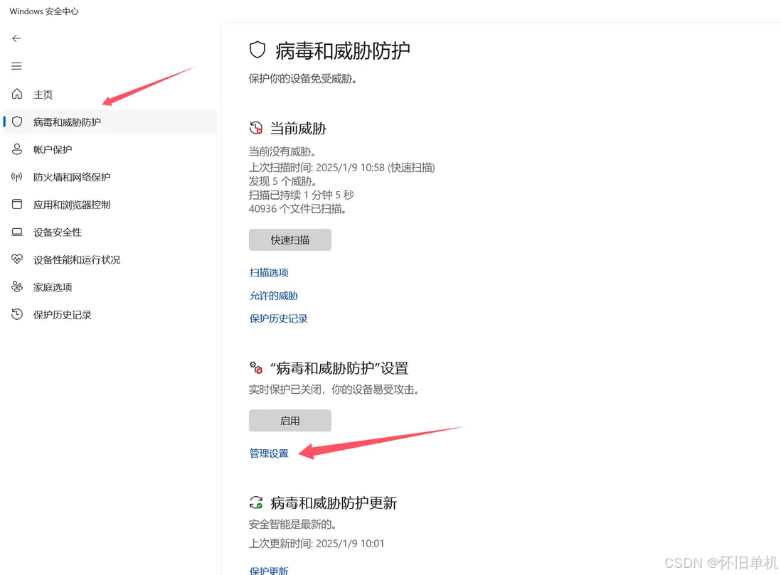 关闭默认杀毒软件和其它自己下的杀毒软件 ,一定要检查关闭!!!! 打开windows的安全中心 ,点击管理设置