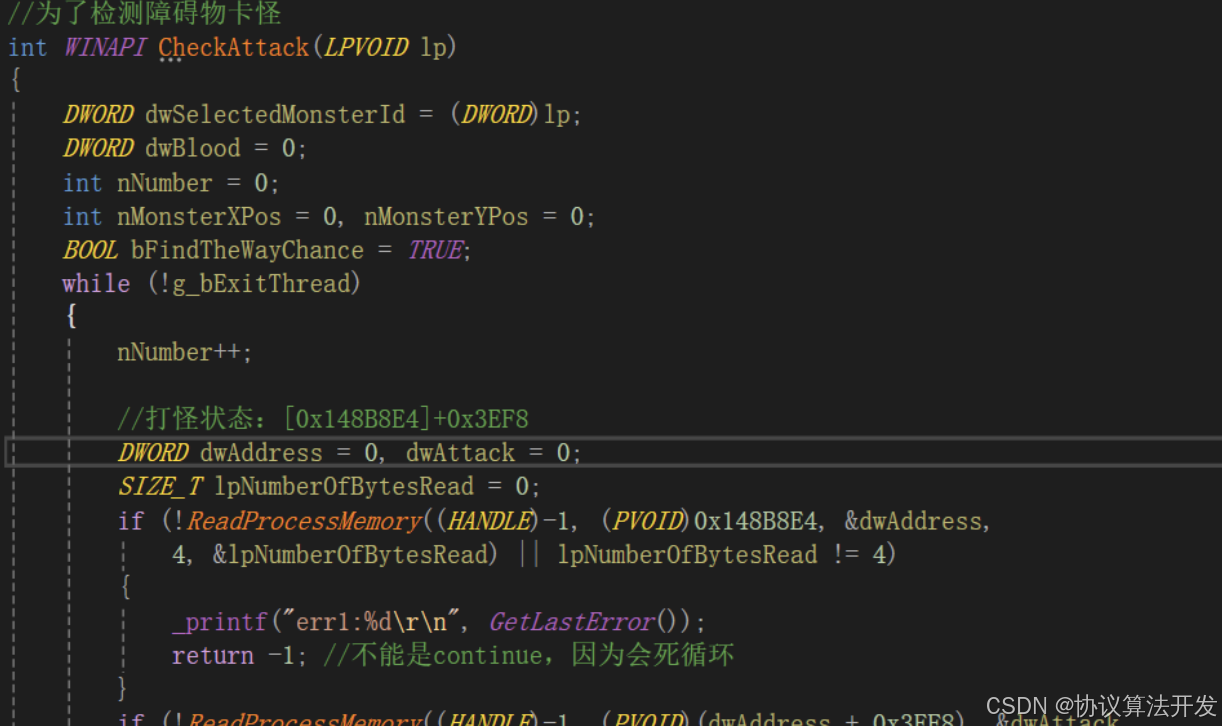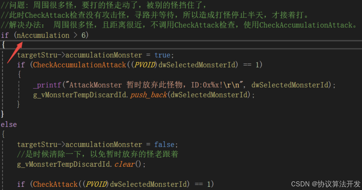 针对它的优化是当周围怪物达到6个以上时,使用CheckAccumulationAttack函数进行快速检查,若没有检查到攻击状态,则暂时放弃此怪物:
