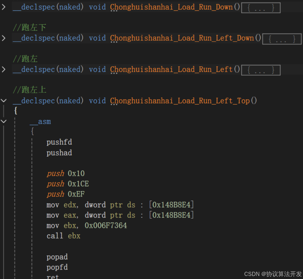 传奇游戏有走路和跑步call,且有8个方向,只是参数不一样。参数的确定,可以分别向8个方向走路或跑步,代码如下: