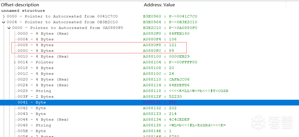 这个比较难用上面的方法搜索到,使用CE工具里面的Structure dissect看的,在里面输入物品结构体的地址:0091bb2c。然后逐级展开结构体: